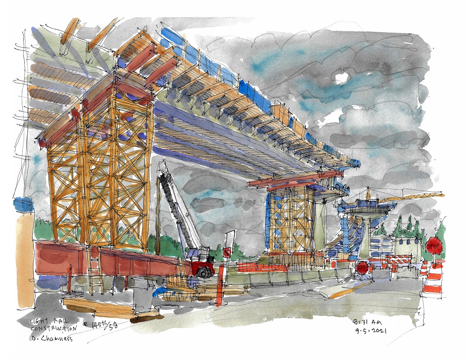 Another round of light rail construction sketch. This time I rode my bike into the "technical" construction site and was asked to leave by a security guard just as I was finishing up. Sometimes you have to break the rules to get to a better spot to sketch. It was a Sunday morning so no one else was around and I didn't put myself in any physical danger. Progress of the sketch.
